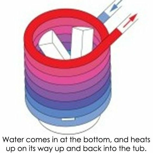 - The water is pushed through the metal coils which surround a wire basket where the firewood is housed. The basket can be raised or lowered to adjust the temperature of the water. There is also a ledge to hold drinks and other items. Keep feeding the fire with wood as desired.