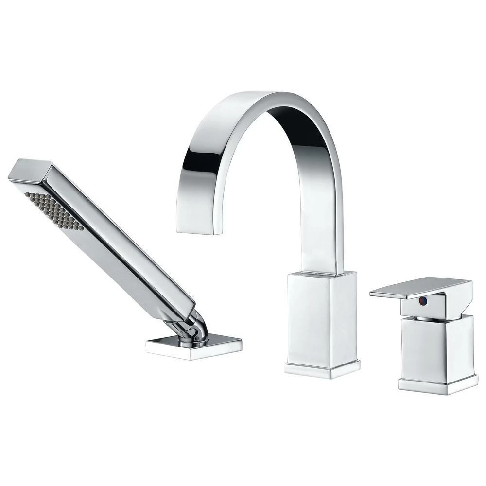 - Three (3) Piece Widespread Deck-Mount Roman Faucet Set with Handheld Sprayer in Chrome Finish
