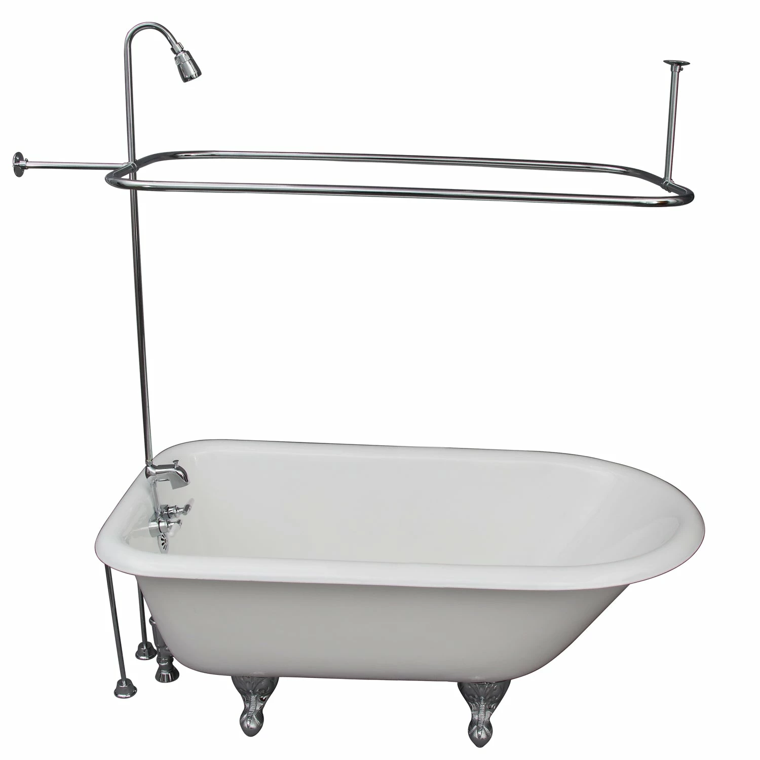 - Kit includes 68″ Cast Iron Tub, Tub Filler with Lever Handles, 56″ Riser, Showerhead, Rectangular Shower Rod, Tub Supplies and tub drain