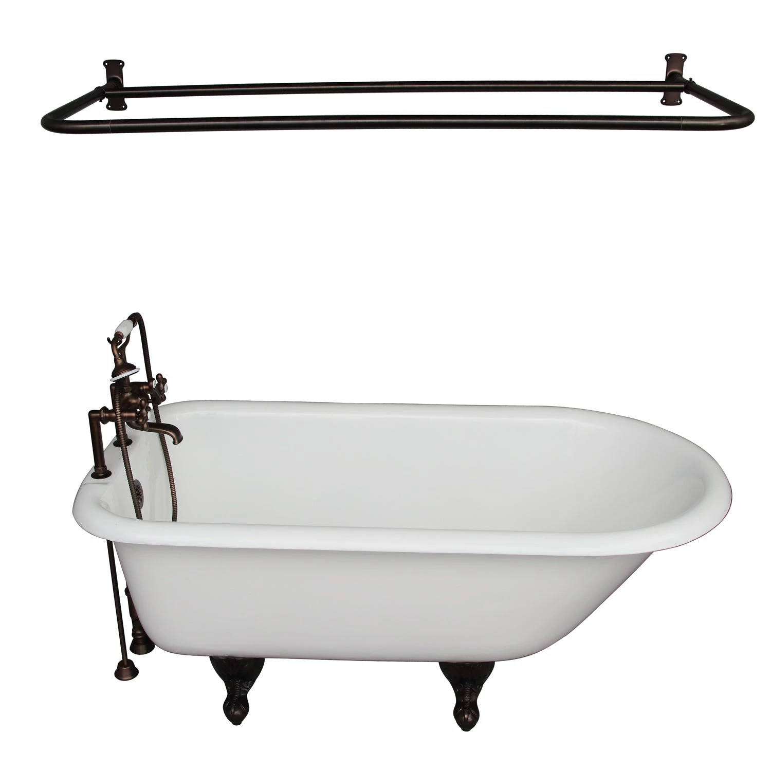 - Kit includes 60″ Cast Iron Tub, Tub Filler with Handshower, ” D” Shower Rod, Tub Supplies and Tub Drain