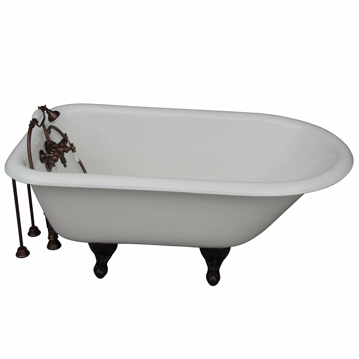 - Kit includes 55″ Cast Iron Tub, Tub Filler with Handshower, Tub Supplies and Tub Drain