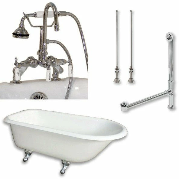 Cast-Iron Rolled Rim Clawfoot Tub 61″ X 30″ with 7″ Deck Mount Faucet Drillings and English Telephone Style Faucet Complete Polished Chrome Plumbing Package