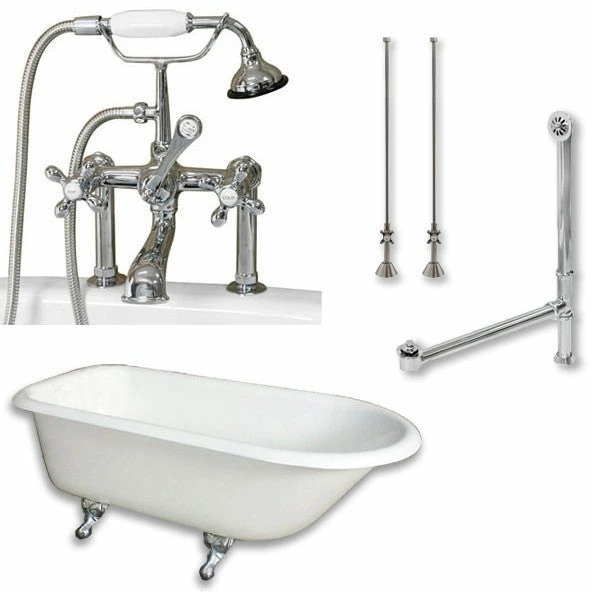 Cast-Iron Rolled Rim Clawfoot Tub 61″ X 30″ with 7″ Deck Mount Faucet Drillings And British Telephone Style Faucet Complete Plumbing Package With Six Inch Deck Mount Risers