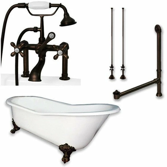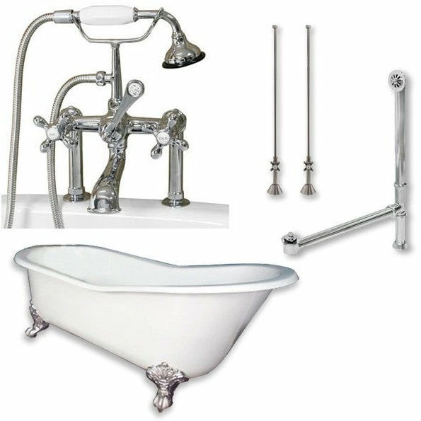 Cambridge Plumbing Cast Iron Slipper Clawfoot Tub 61″ X 30″ with 7″ Deck Mount Faucet Drillings and British Telephone Style Faucet Complete Plumbing Package With Six Inch Deck Mount Risers
