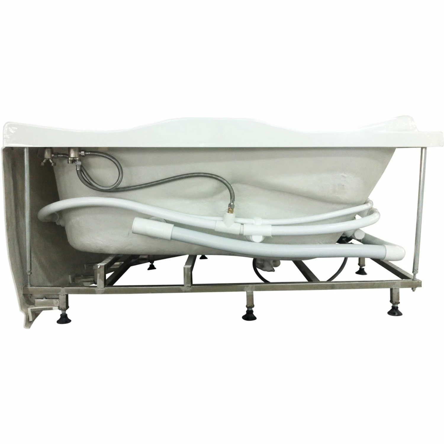 - This tub fills itself through the jets! Tub comes with chrome fixtures, but if you’d like you can replace them and use your own instead.