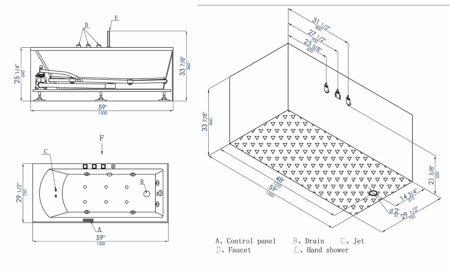 - Keypad Control Panel: Stylish control panel easily operates the bathtubs whirlpool jets, inline heater, digital sound system, and chromatherapy lighting.