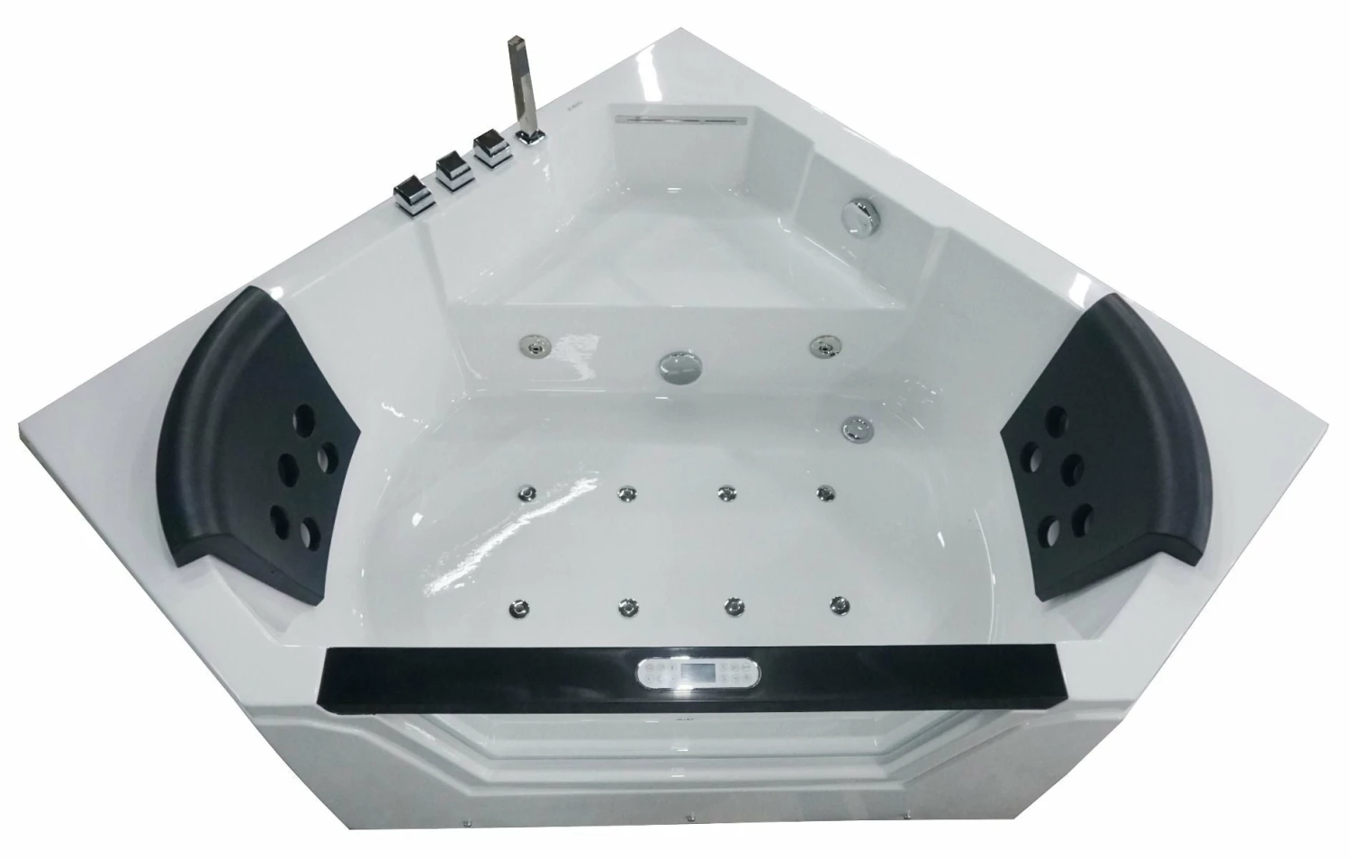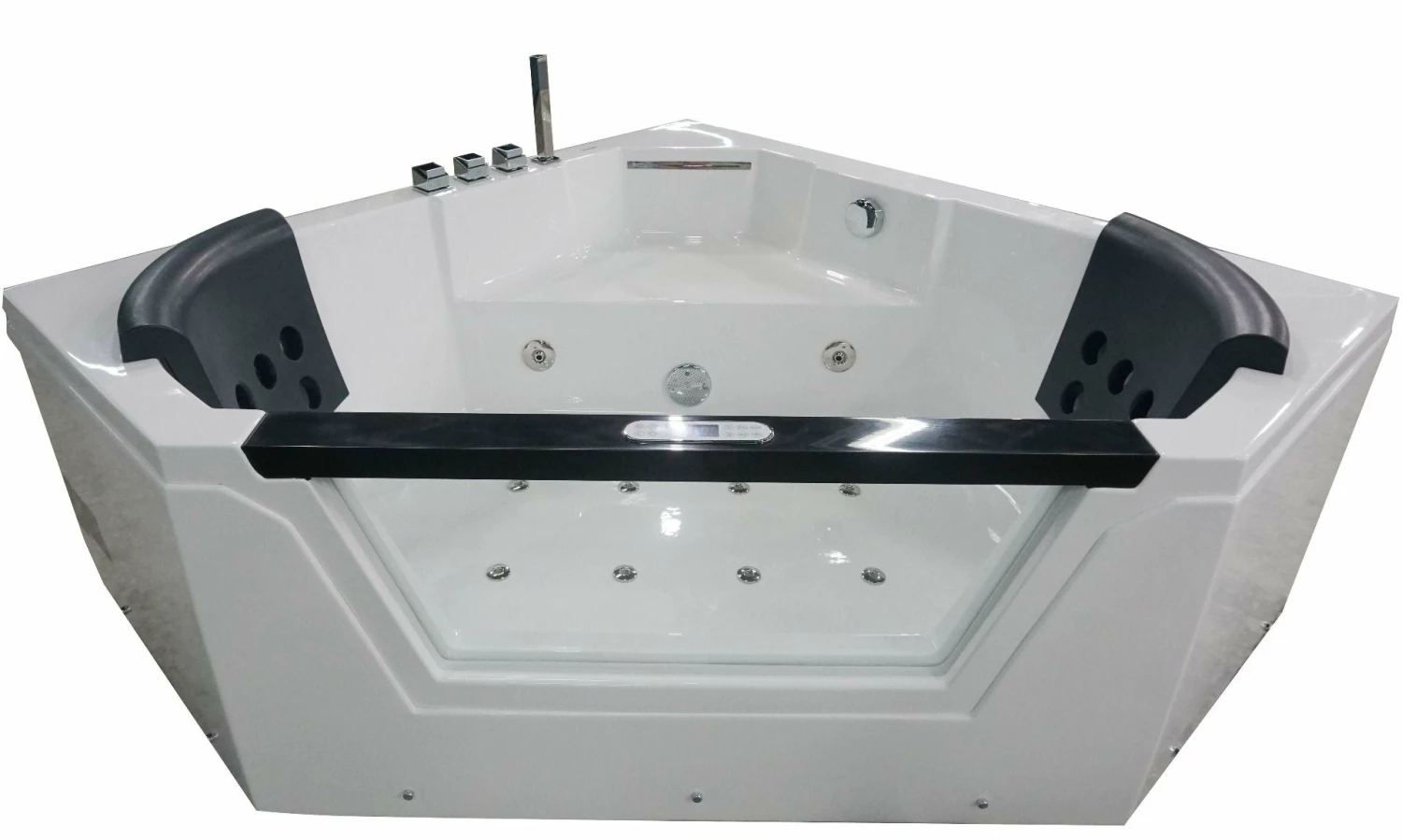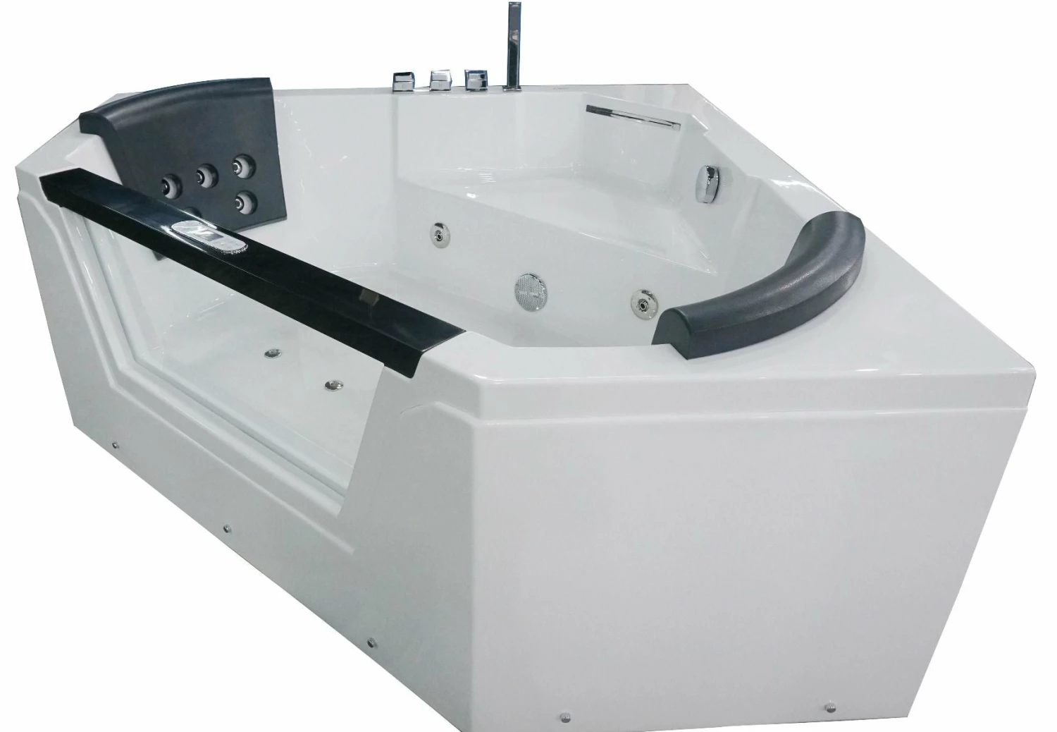 - Please note that this tub fills itself through the jets! Tub comes with chrome fixtures, but if you’d like you can replace them and use your own instead. Includes a square shaped hand held shower head.