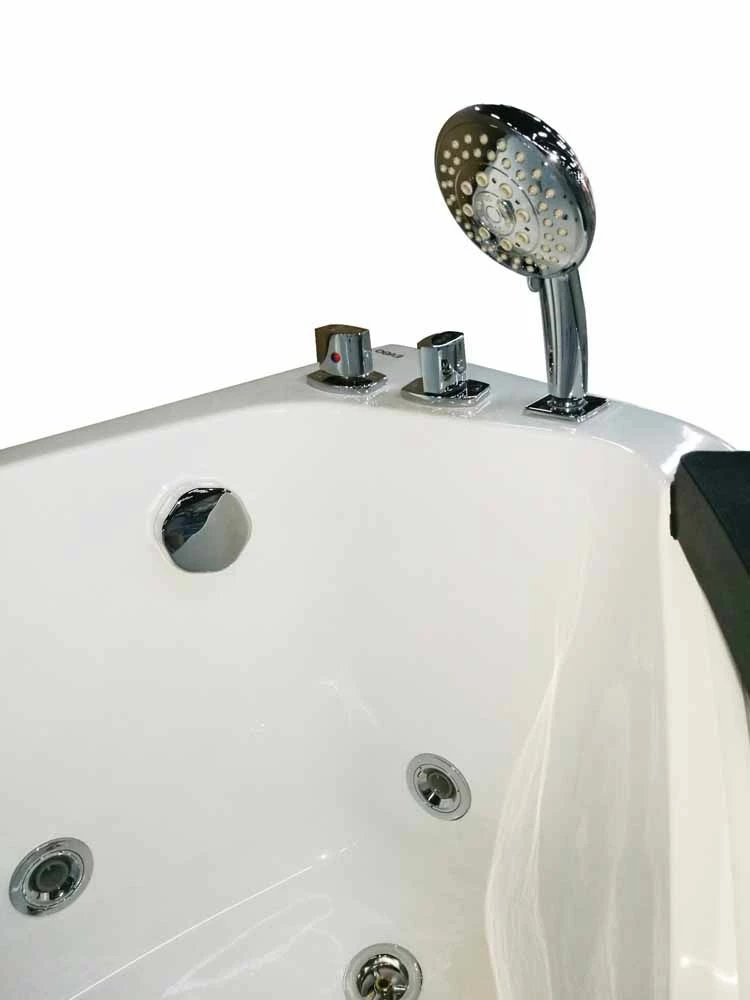 - This tub fills itself through the jets! Tub comes with chrome fixtures, but if you’d like you can replace them and use your own instead.