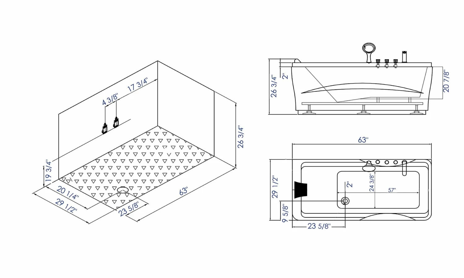 - Fixtures Included: tub filler, hand held shower head, head rest.