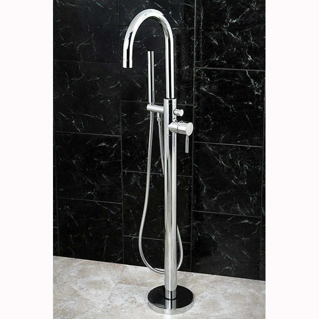 Standing on a single post, the Kingston Brass Concord Tub Filler features a stunning design with a gooseneck spout and hand shower. The water is diverted from the spout to hand shower with the push of a button and the faucet features use of a ceramic disc cartridge for drip-free performance. The tub filler is constructed from solid brass for durability and reliability and features an overall height of 46″. The smooth lines and sleek curves make this a perfect fit for any contemporary freestanding bathtub.