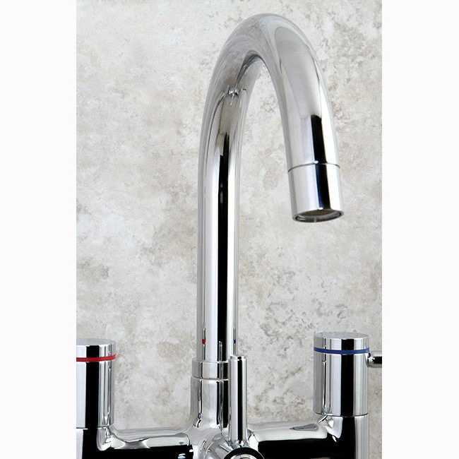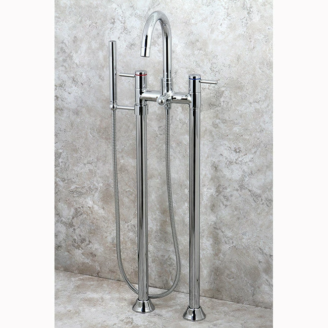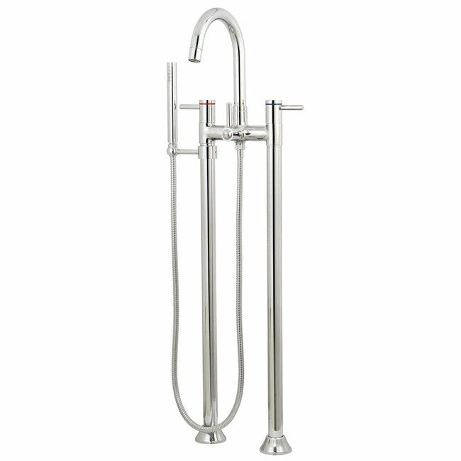 Standing boldly, the Kingston Brass Concord Freestanding Tub Filler will bring focus to your bathtub with its robust styling and solid construction. With two long support posts, this filler stands at over 40″ and features a gooseneck spout. The lever handles turn smoothly and water is easily diverted between the spout and hand shower by adjusting the lever on the body. The tub faucet features ceramic disc cartridges and is the perfect match for any freestanding bathtub.