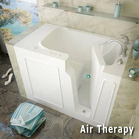 The Meditub 2952 walk-in bathtub features Meditub’s knee cutaway technology. The door can be placed on the right or left side and has a knee cutaway so that the bather can open and close the door while seated in the 17″ ADA Compliant contoured seat. This walk in tub is perfect for new construction and/or retro fitting because of its industry standard size. It is available in several variations such as with whirlpool only, air only, with a combination of both whirlpool and air systems (dual system), or as a soaker, with no jets at all.