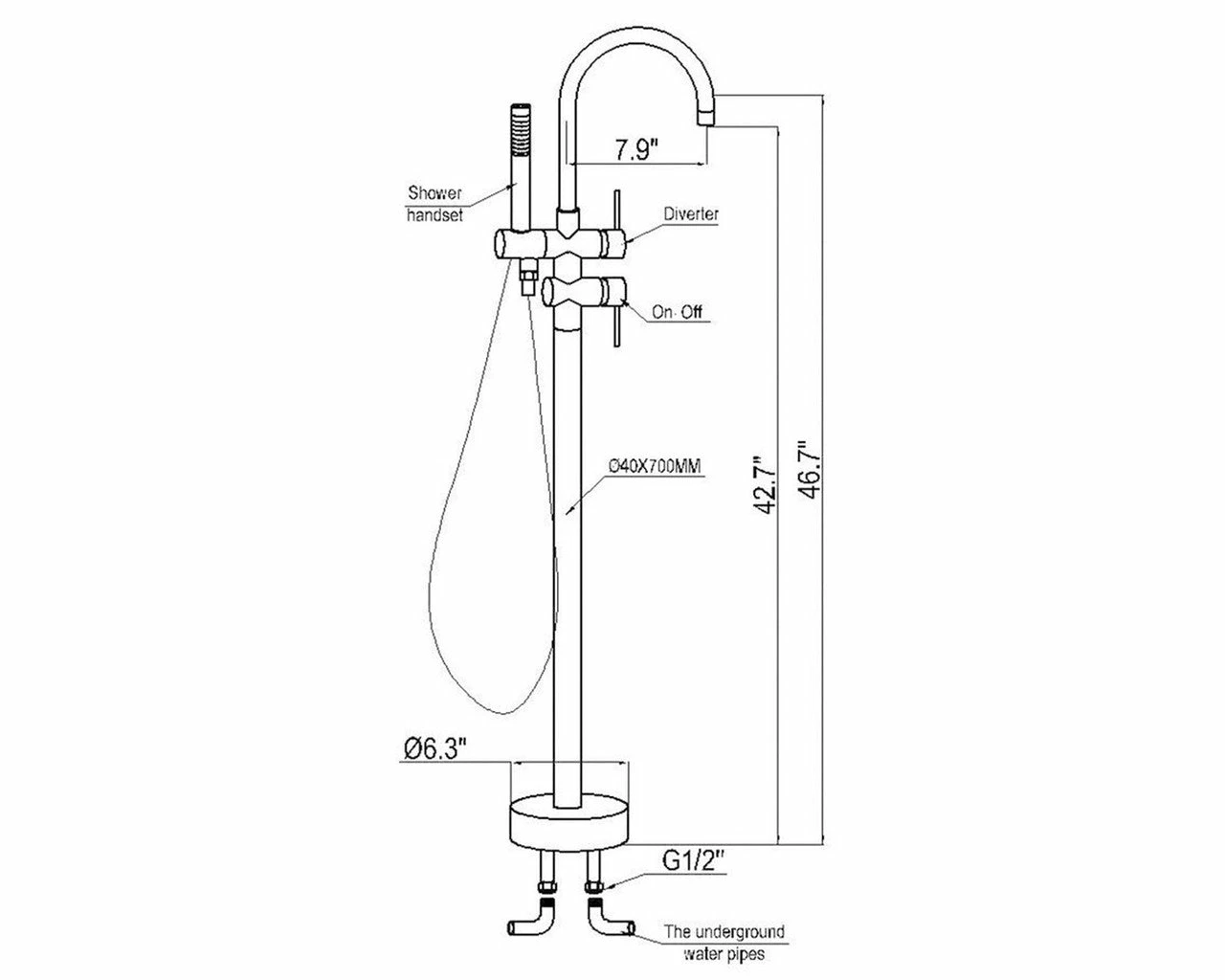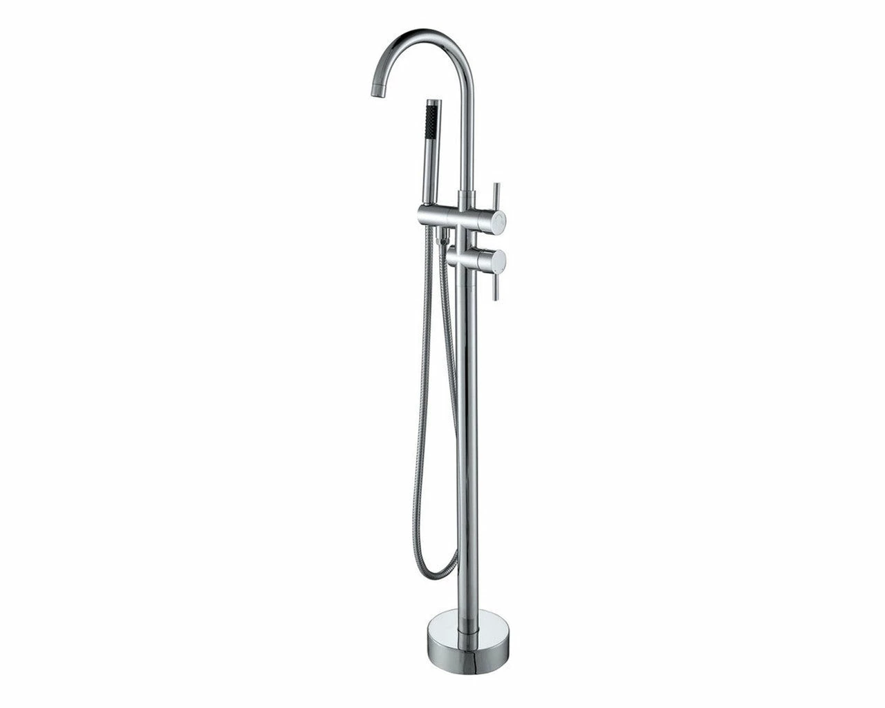 This modern floor-mounted freestanding tub filler faucet is completely ready to install. This fixture will work great with a freestanding or claw foot tub. The high arch spout allows you to get up and over the edge of a taller tub. This item features a hand held spray for added convenience. It has a double handle to control the hot and cold water that comes out the tub spout, allowing you to adjust both temperature and volume of water.This stylish tub faucet is designed to rapidly fill a tub so you can get to soaking sooner. It puts out 18 gallons of water per minute, enough to quickly fill even the largest tub. This fixture comes complete with the required Rough-in Valve which installs in the bathroom floor near the tub. Buy this item if plan on installing an above ground freestanding or claw foot tub. The high arch of the spout of this tub filler will be perfect for this type of job.
